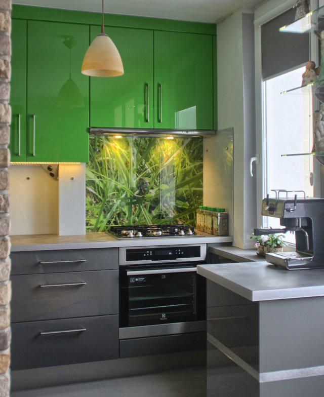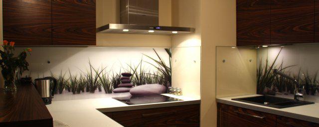Lubimy szkło, bo błyszczy, refleksy świetlne urozmaicają pomieszczenie, dodają głębi, dobrze komponują się z nowoczesnymi meblami i elementami wykończeniowymi ze stali nierdzewnej i aluminium. Najczęściej używamy szkła bezpiecznego, składającego się z dwóch szyb z wklejoną między nie folią zabezpieczającą. Folia może mieć nadrukowany powtarzalny deseń albo fotografię. Możemy skorzystać z gotowych wzorów lub użyć dowolnego zdjęcia (o ile oczywiście jest w odpowiedniej rozdzielczości). Tu przykład wykorzystania w realizowanej kuchni własnej fotografii dostarczonej przez klienta:
